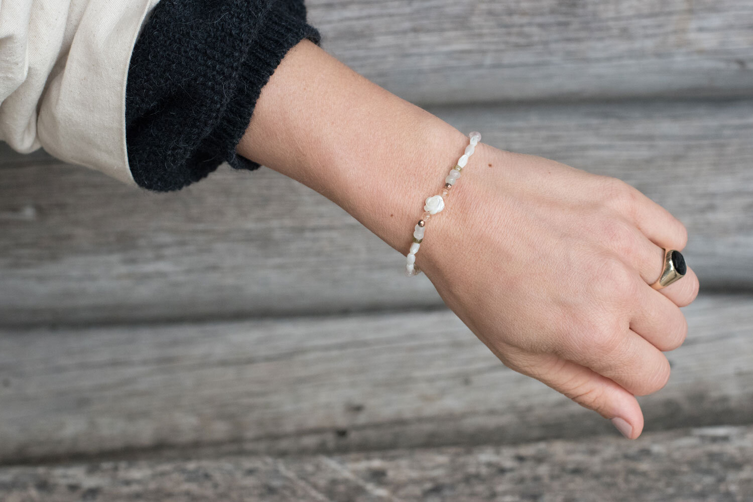 Zusammen mit Sheila von Eyonawa habe ich Themen, die immer wieder in der Praxis aufkommen, gesammelt. Daraus sind vier verschiedene Armketten entstanden, welche alle eine unterschiedliche Wirkung mit sich bringen. Ich schätze es sehr, anhand von schönen Gegenständen die Themen, die einen beschäftigen, eine Zeit lang mit sich tragen und sich auf diese Weise bewusst machen zu können, woran man arbeitet.